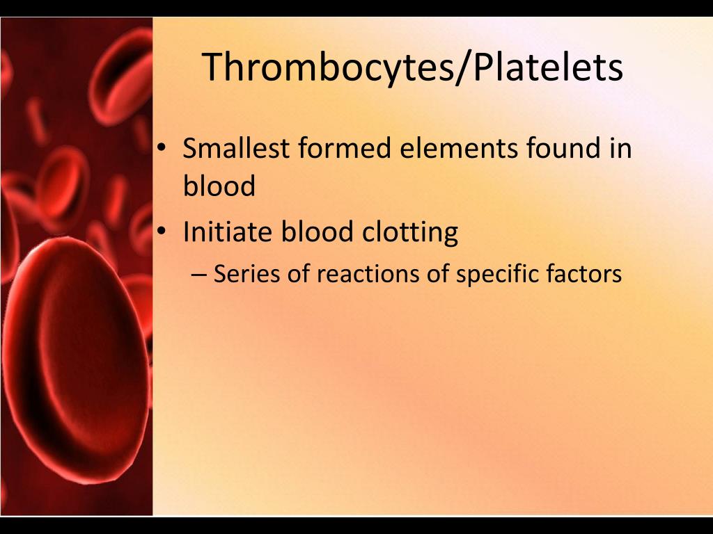 Thrombocytes/Platelets • Smallest formed elements found in blood • Initiate blood clotting • Series of reactions of specific factors
