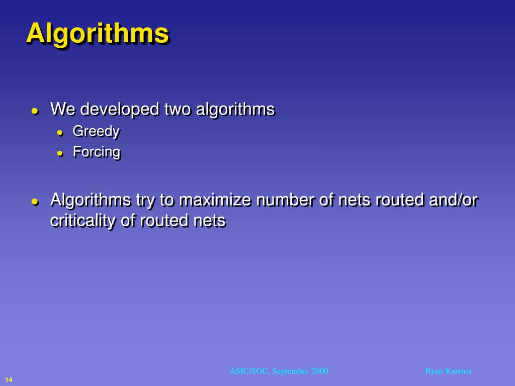 Algorithms • We developed two algorithms • Greedy • Forcing • Algorithms try to maximize number of nets routed and/or criticality of routed nets 14