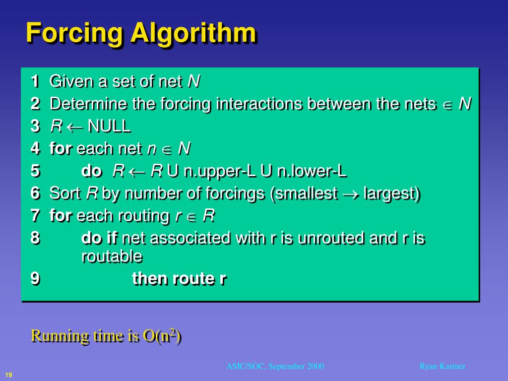 Forcing Algorithm 1 Given a set of net N 2 Determine the forcing interactions between the nets N 3 R NULL 4 for each net n N 5 doR R U n.upper-L U n.lower-L 6 Sort R by number of forcings (smallest largest) 7 for each routing r R 8 do if net associated with r is unrouted and r is routable 9then route r Running time is O(n2) 19