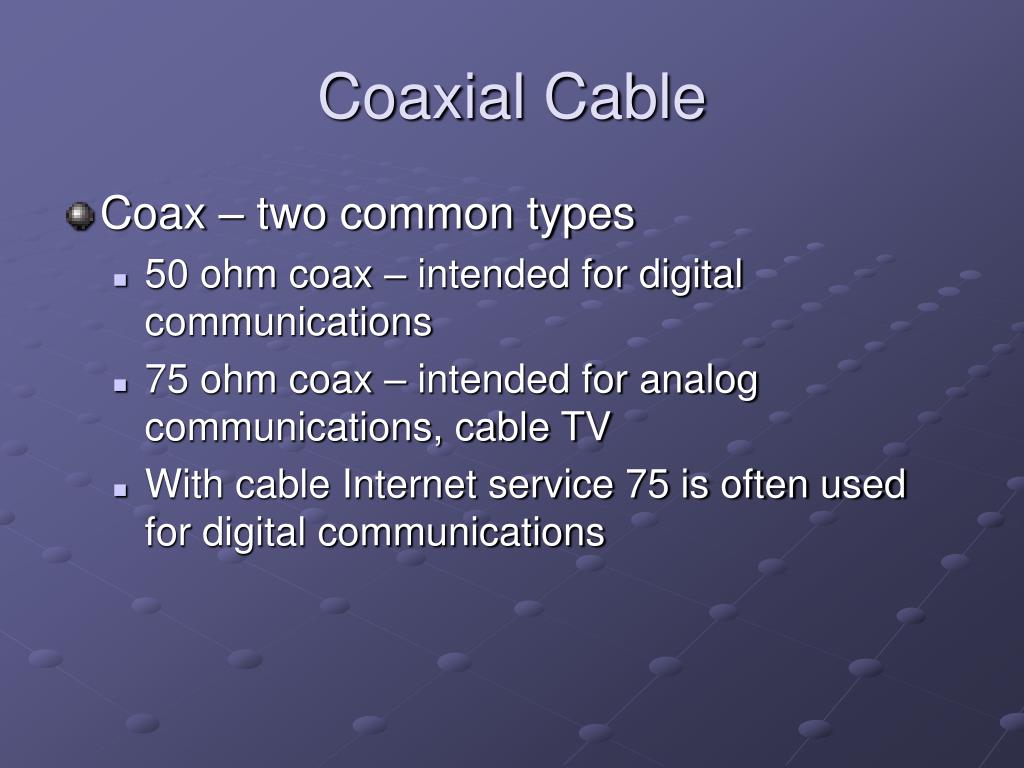 Coaxial Cable • Coax – two common types • 50 ohm coax – intended for digital communications • 75 ohm coax – intended for analog communications, cable TV • With cable Internet service 75 is often used for digital communications