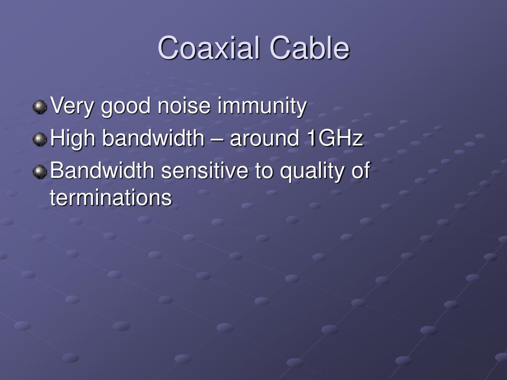 Coaxial Cable • Very good noise immunity • High bandwidth – around 1GHz • Bandwidth sensitive to quality of terminations