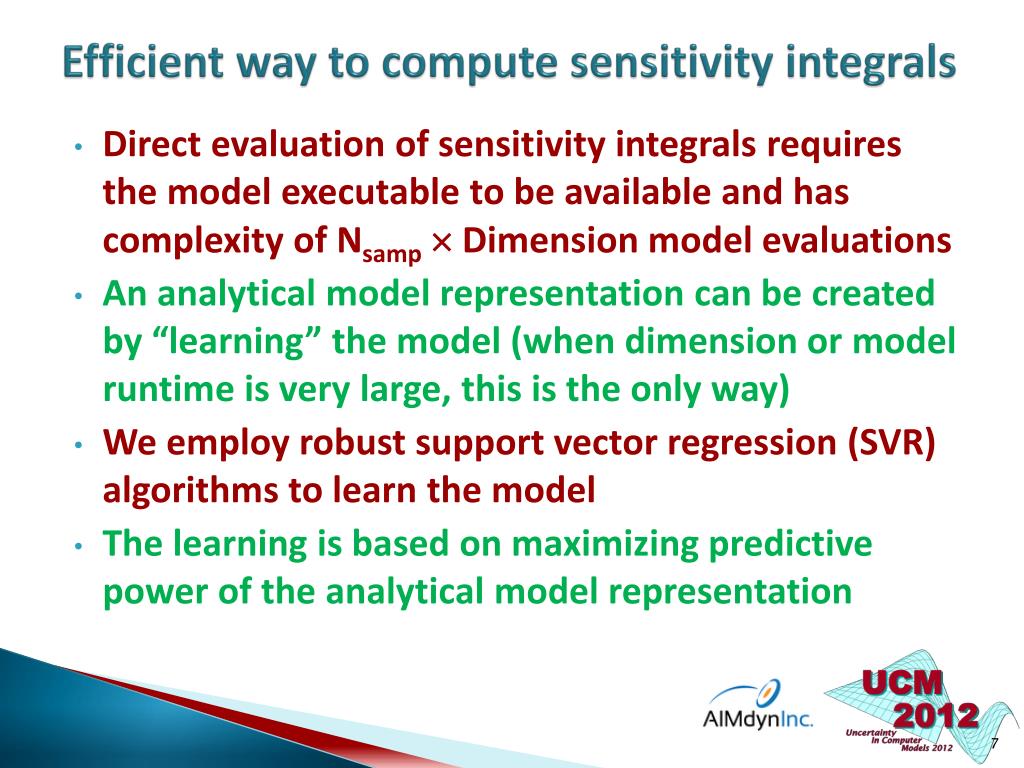 Efficient way to compute sensitivity integrals • Direct evaluation of sensitivity integrals requires the model executable to be available and has complexity of Nsamp Dimension model evaluations • An analytical model representation can be created by “learning” the model (when dimension or model runtime is very large, this is the only way) • We employ robust support vector regression (SVR) algorithms to learn the model • The learning is based on maximizing predictive power of the analytical model representation