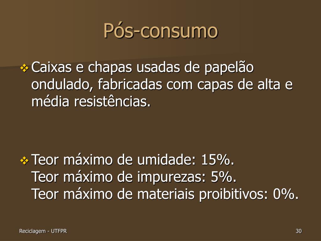 Pós-consumo • Caixas e chapas usadas de papelão ondulado, fabricadas com capas de alta e média resistências. • Teor máximo de umidade: 15%.Teor máximo de impurezas: 5%. Teor máximo de materiais proibitivos: 0%.