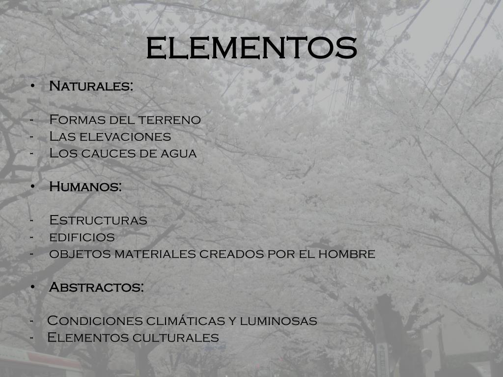 ELEMENTOS • Naturales: • Formas del terreno • Las elevaciones • Los cauces de agua • Humanos: • Estructuras • edificios • objetos materiales creados por el hombre • Abstractos: - Condiciones climáticas y luminosas - Elementos culturales