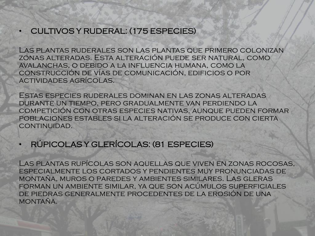 CULTIVOS Y RUDERAL: (175 ESPECIES) Las plantas ruderales son las plantas que primero colonizan zonas alteradas. Esta alteración puede ser natural, como avalanchas, o debido a la influencia humana, como la construcción de vías de comunicación, edificios o por actividades agrícolas.Estas especies ruderales dominan en las zonas alteradas durante un tiempo, pero gradualmente van perdiendo la competición con otras especies nativas, aunque pueden formar poblaciones estables si la alteración se produce con cierta continuidad. • RÚPICOLAS Y GLERÍCOLAS: (81 ESPECIES) Las plantas rupícolas son aquellas que viven en zonas rocosas, especialmente los cortados y pendientes muy pronunciadas de montaña, muros o paredes y ambientes similares. Las gleras forman un ambiente similar, ya que son acúmulos superficiales de piedras generalmente procedentes de la erosión de una montaña.