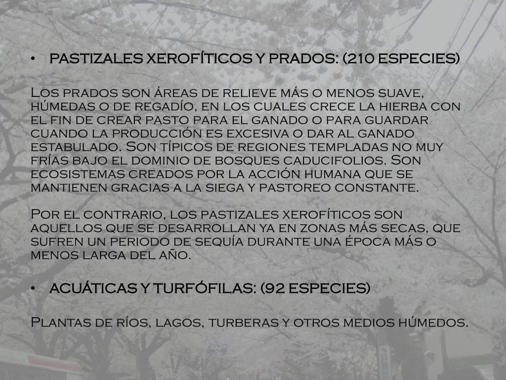 PASTIZALES XEROFÍTICOS Y PRADOS: (210 ESPECIES) Los prados son áreas de relieve más o menos suave, húmedas o de regadío, en los cuales crece la hierba con el fin de crear pasto para el ganado o para guardar cuando la producción es excesiva o dar al ganado estabulado. Son típicos de regiones templadas no muy frías bajo el dominio de bosques caducifolios. Son ecosistemas creados por la acción humana que se mantienen gracias a la siega y pastoreo constante.Por el contrario, los pastizales xerofíticos son aquellos que se desarrollan ya en zonas más secas, que sufren un periodo de sequía durante una época más o menos larga del año. • ACUÁTICAS Y TURFÓFILAS: (92 ESPECIES) Plantas de ríos, lagos, turberas y otros medios húmedos.