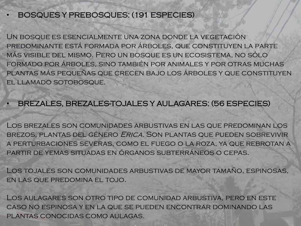 BOSQUES Y PREBOSQUES: (191 ESPECIES) Un bosque es esencialmente una zona donde la vegetación predominante está formada por árboles, que constituyen la parte más visible del mismo. Pero un bosque es un ecosistema, no sólo formado por árboles, sino también por animales y por otras muchas plantas más pequeñas que crecen bajo los árboles y que constituyen el llamado sotobosque. • BREZALES, BREZALES-TOJALES Y AULAGARES: (56 ESPECIES) Los brezales son comunidades arbustivas en las que predominan los brezos, plantas del género Erica. Son plantas que pueden sobrevivir a perturbaciones severas, como el fuego o la roza, ya que rebrotan a partir de yemas situadas en órganos subterráneos o cepas.Los tojales son comunidades arbustivas de mayor tamaño, espinosas, en las que predomina el tojo.Los aulagares son otro tipo de comunidad arbustiva, pero en este caso no espinosa y en la que se pueden encontrar dominando las plantas conocidas como aulagas.