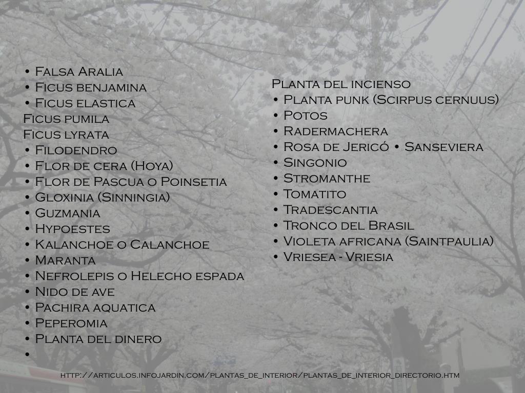 • Falsa Aralia• Ficus benjamina• Ficus elastica Ficus pumila Ficus lyrata• Filodendro• Flor de cera (Hoya)• Flor de Pascua o Poinsetia• Gloxinia (Sinningia)• Guzmania• Hypoestes• Kalanchoe o Calanchoe• Maranta• Nefrolepis o Helecho espada • Nido de ave• Pachiraaquatica• Peperomia• Planta del dinero• Planta del incienso• Planta punk (Scirpuscernuus)• Potos• Radermachera• Rosa de Jericó •Sanseviera• Singonio• Stromanthe• Tomatito • Tradescantia• Tronco del Brasil• Violeta africana (Saintpaulia)• Vriesea - Vriesia http://articulos.infojardin.com/plantas_de_interior/plantas_de_interior_directorio.htm