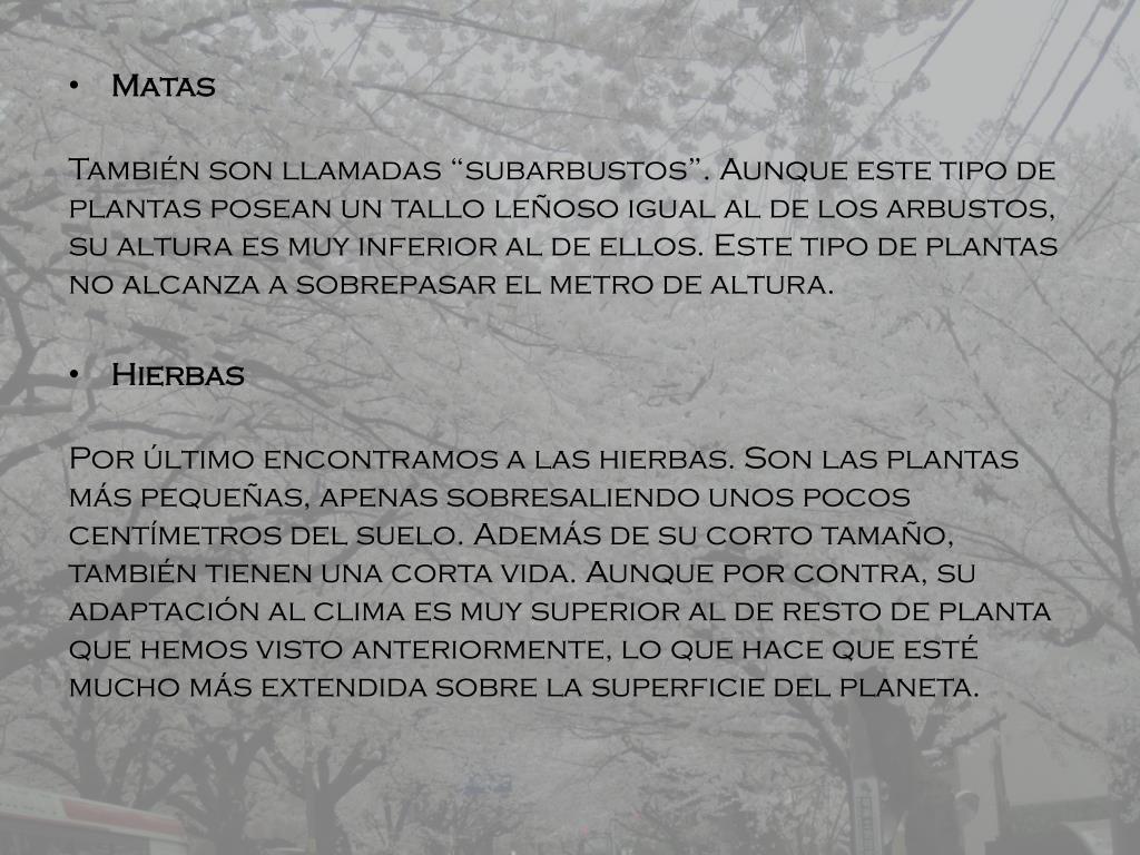 Matas También son llamadas “subarbustos”. Aunque este tipo de plantas posean un tallo leñoso igual al de los arbustos, su altura es muy inferior al de ellos. Este tipo de plantas no alcanza a sobrepasar el metro de altura. • Hierbas Por último encontramos a las hierbas. Son las plantas más pequeñas, apenas sobresaliendo unos pocos centímetros del suelo. Además de su corto tamaño, también tienen una corta vida. Aunque por contra, su adaptación al clima es muy superior al de resto de planta que hemos visto anteriormente, lo que hace que esté mucho más extendida sobre la superficie del planeta.