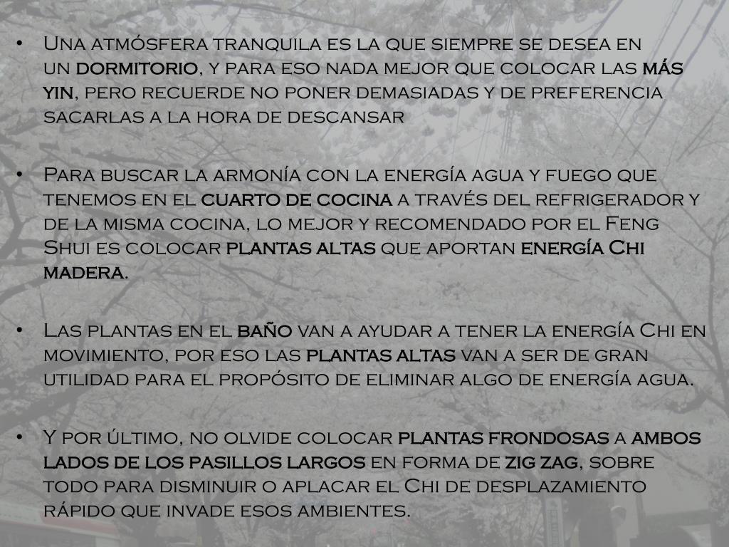 Una atmósfera tranquila es la que siempre se desea en un dormitorio, y para eso nada mejor que colocar las más yin, pero recuerde no poner demasiadas y de preferencia sacarlas a la hora de descansar • Para buscar la armonía con la energía agua y fuego que tenemos en el cuarto de cocina a través del refrigerador y de la misma cocina, lo mejor y recomendado por el Feng Shui es colocar plantas altas que aportan energía Chi madera. • Las plantas en el baño van a ayudar a tener la energía Chi en movimiento, por eso las plantas altas van a ser de gran utilidad para el propósito de eliminar algo de energía agua. • Y por último, no olvide colocar plantas frondosas a ambos lados de los pasillos largos en forma de zigzag, sobre todo para disminuir o aplacar el Chi de desplazamiento rápido que invade esos ambientes.