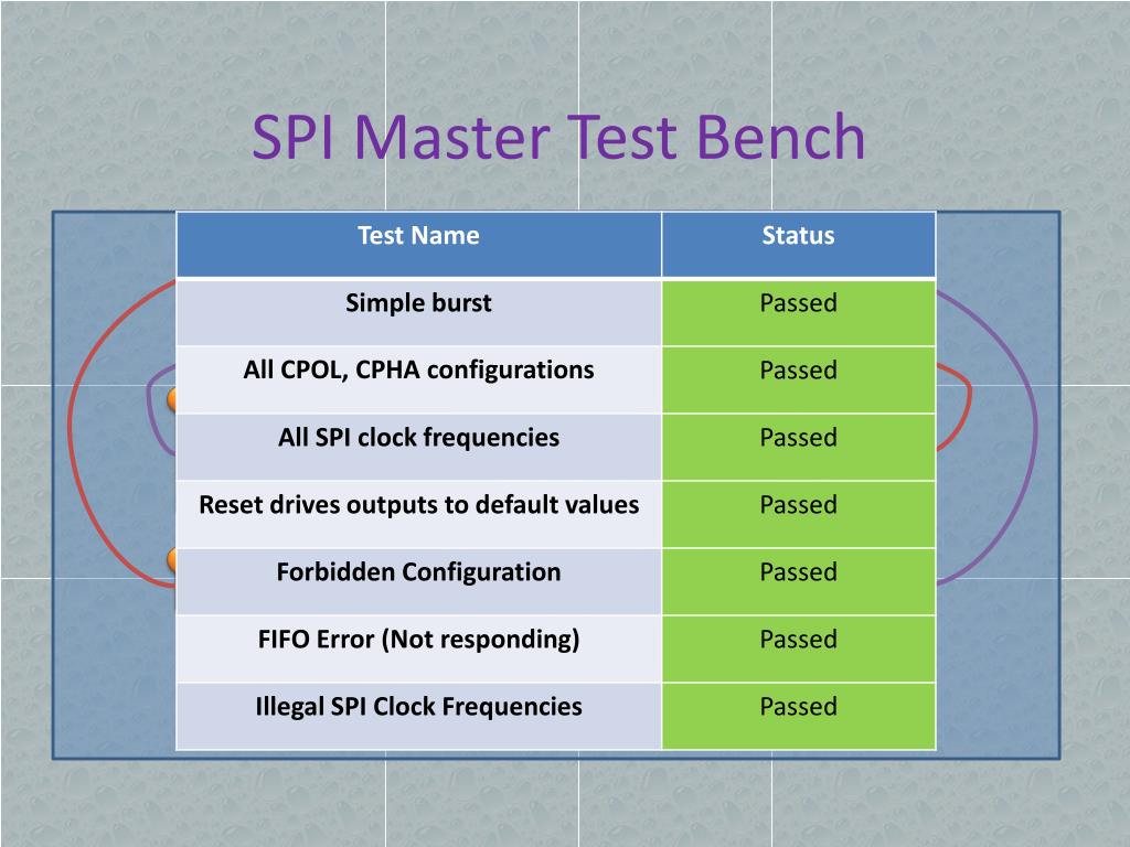COVERGROUP COVERAGE:----------------------------------------------------------------------------------------------------Covergroup Metric Goal/ Status At Least ---------------------------------------------------------------------------------------------------- TYPE /top/master_host_monitor/cov_trans 100.0% 100 Covered Coverpointcov_trans::length 100.0% 100 Covered Coverpointcov_trans::init_addr 100.0% 100 Covered Coverpointcov_trans::div_factor 100.0% 100 Covered Coverpointcov_trans::cpol_cpha 100.0% 100 Covered CLASS master_host_monitorTOTAL COVERGROUP COVERAGE: 100.0% COVERGROUP TYPES: 1 SV Verification Summary Total of 7 major bugs were found and fixed: SPI Master – 2 SPI Slave – 3 Top – 2 Reached 100 % functional coverage for all TBs