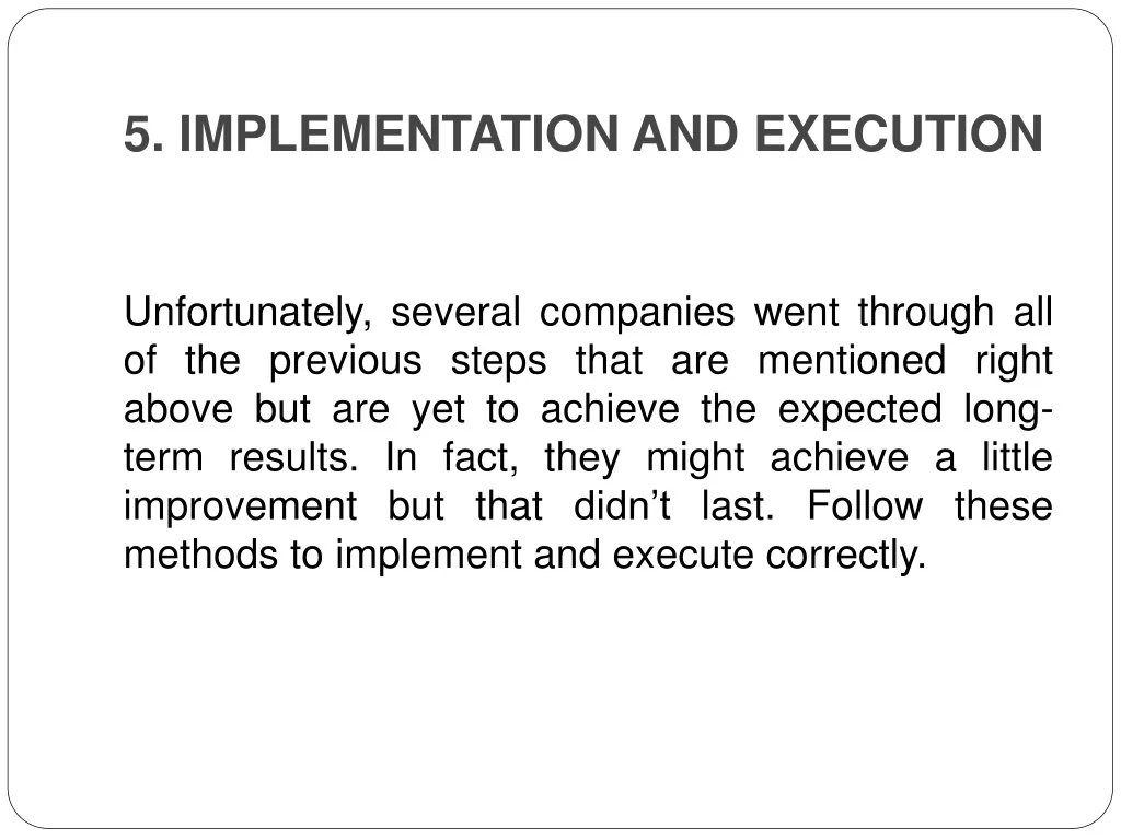 5. IMPLEMENTATION AND EXECUTION Unfortunately, several companies went through all of the previous steps that are mentioned right above but are yet to achieve the expected long-term results. In fact, they might achieve a little improvement but that didn’t last. Follow these methods to implement and execute correctly.
