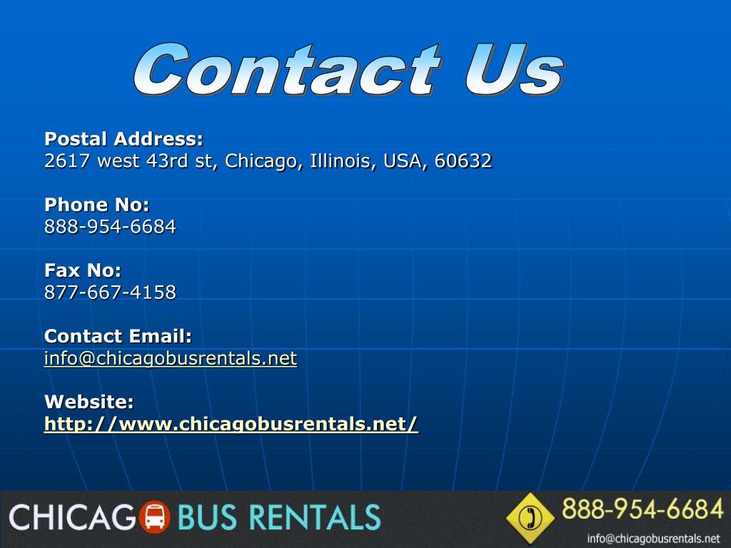 Contact Us Postal Address: 2617 west 43rd st, Chicago, Illinois, USA, 60632 Phone No: 888-954-6684 Fax No: 877-667-4158 Contact Email: info@chicagobusrentals.net Website: http://www.chicagobusrentals.net/