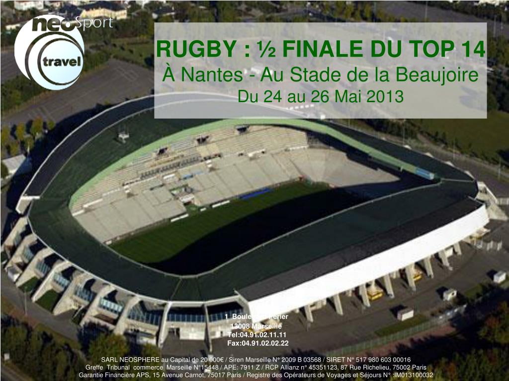 RUGBY : ½ FINALE DU TOP 14 À Nantes - Au Stade de la Beaujoire Du 24 au 26 Mai 2013 1Boulevard Perier 13008 Marseille Tel:04.91.02.11.11 Fax:04.91.02.02.22 SARL NEOSPHERE au Capital de 20 000€ / Siren Marseille N° 2009 B 03568 / SIRET N° 517 980 603 00016 Greffe Tribunal commerce Marseille N°15448 / APE: 7911 Z / RCP Allianz n° 45351123, 87 Rue Richelieu, 75002 ParisGarantie Financière APS, 15 Avenue Carnot, 75017 Paris / Registre des Opérateurs de Voyages et Séjours N° :IM013100032