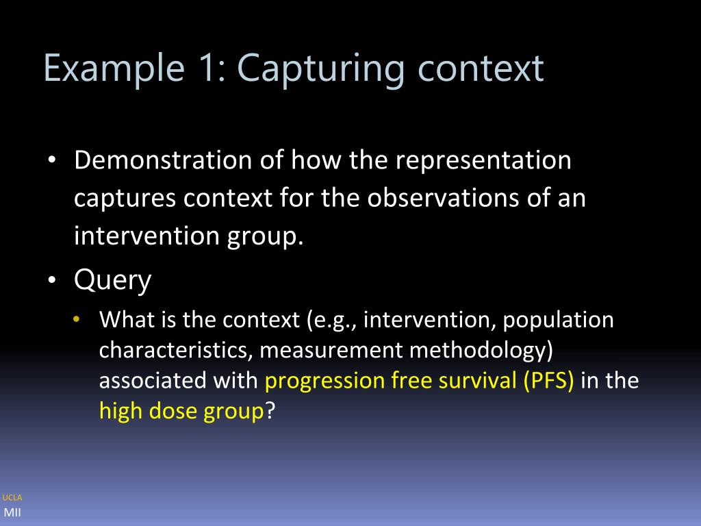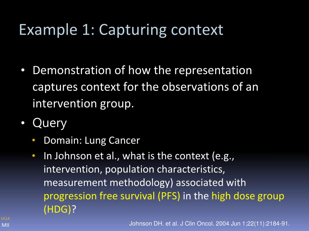 Example 1: Capturing context • Demonstration of how the representation captures context for the observations of an intervention group. • Query • Domain: Lung Cancer • In Johnson et al., what is the context (e.g., intervention, population characteristics, measurement methodology) associated with progression free survival (PFS) in the high dose group (HDG)? Johnson DH. et al. J Clin Oncol. 2004 Jun 1;22(11):2184-91.