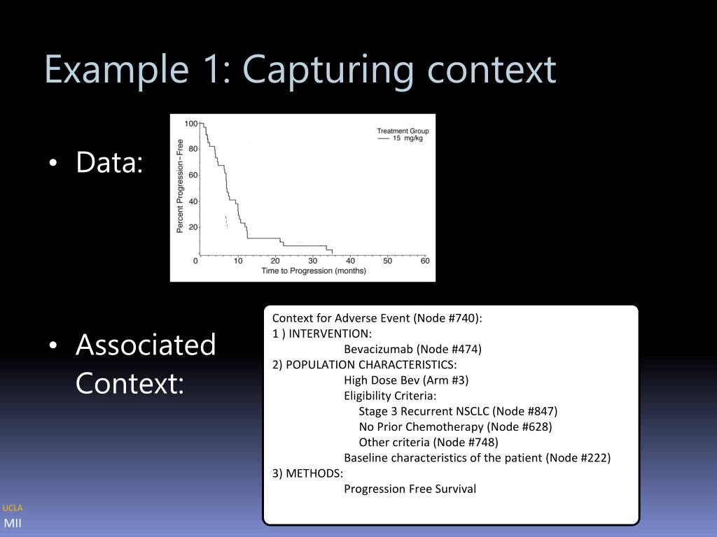 Example 1: Capturing context • Data: • AssociatedContext: Context for Adverse Event (Node #740): 1 ) INTERVENTION: • Bevacizumab (Node #474) • 2) POPULATION CHARACTERISTICS: • High Dose Bev (Arm #3) • Eligibility Criteria: • Stage 3 Recurrent NSCLC (Node #847) • No Prior Chemotherapy (Node #628) • Other criteria (Node #748) • Baseline characteristics of the patient (Node #222) 3) METHODS: Progression Free Survival