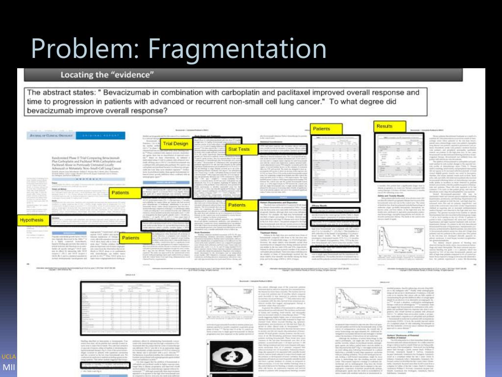 Why Focus on Numerical Info Patient Recruitment • Predictive disease modeling • Ex: Bayesian Belief Networks • Key to identifying trial quality • Hypothesis testing context and measures • Key to synthesizing evidence • What is the context for reported probabilities • P ( effect | cause, context ) Internal Validity Disease Modeling