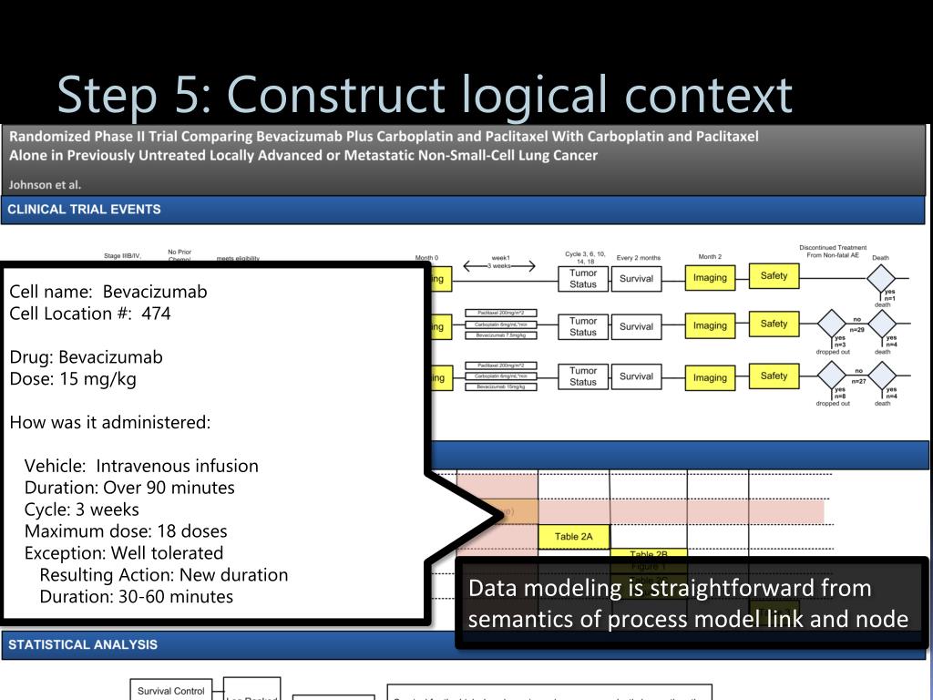 Step 5: Construct logical context Cell name: Bevacizumab Cell Location #: 474 Drug: Bevacizumab Dose: 15 mg/kg How was it administered: Vehicle: Intravenous infusion Duration: Over 90 minutes Cycle: 3 weeks Maximum dose: 18 doses Exception: Well tolerated Resulting Action: New duration Duration: 30-60 minutes Data modeling is straightforward from semantics of process model link and node