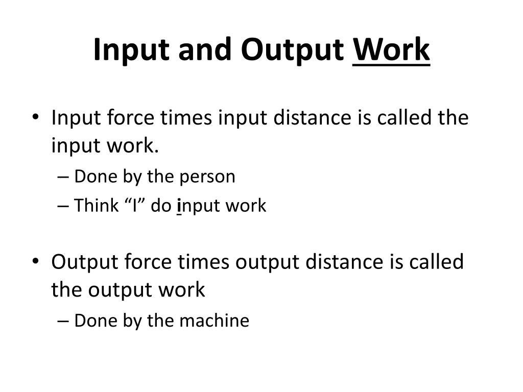 Input and Output Work • Input force times input distance is called the input work. • Done by the person • Think “I” do input work • Output force times output distance is called the output work • Done by the machine