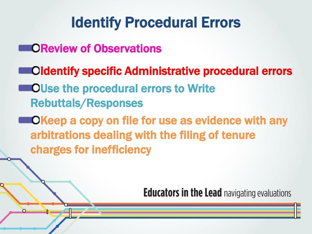 Identify Procedural Errors • Review of Observations • Identify specific Administrative procedural errors • Use the procedural errors to Write Rebuttals/Responses • Keep a copy on file for use as evidence with any arbitrations dealing with the filing of tenure charges for inefficiency
