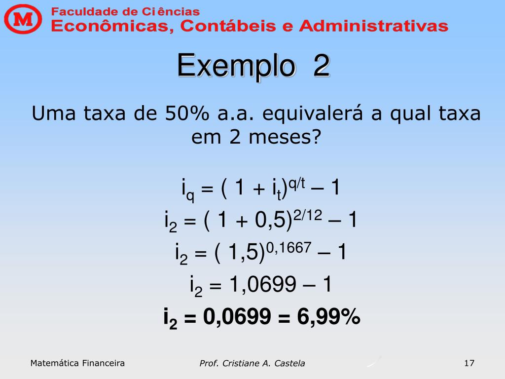 Exemplo 1 iq = ( 1 + it)q/t – 1 i200 = ( 1 + 0,8)200/360 – 1 i200 = ( 1,8)0,5556 – 1 i200 = 1,3862 – 1 i200 = 0,3862 = 38,62% Uma taxa de 80% a.a. equivalerá a qual taxa em 200 dias? Matemática Financeira 16 Prof. Cristiane A. Castela