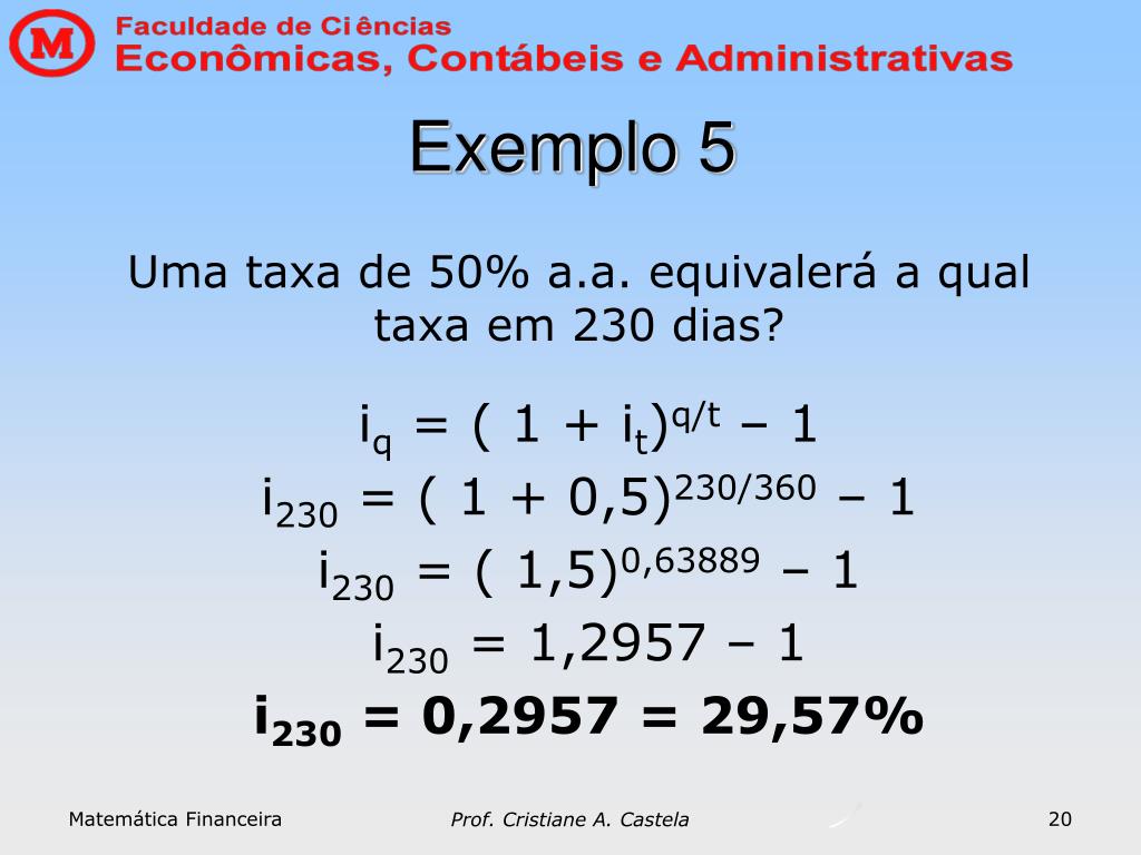 Exemplo 4 Uma taxa de 50% a.a. equivalerá a qual taxa em 1 dia? iq = ( 1 + it)q/t – 1 i1 = ( 1 + 0,5)1/360 – 1 i1 = ( 1,5)0,00278 – 1 i1 = 1,00113 – 1 i1 = 0,00113 = 0,113% Matemática Financeira 19 Prof. Cristiane A. Castela