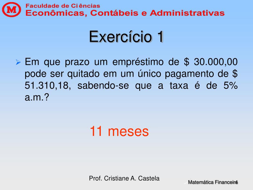 Prof. Cristiane A. Castela Exercício 1 • Em que prazo um empréstimo de $ 30.000,00 pode ser quitado em um único pagamento de $ 51.310,18, sabendo-se que a taxa é de 5% a.m.? 11 meses
