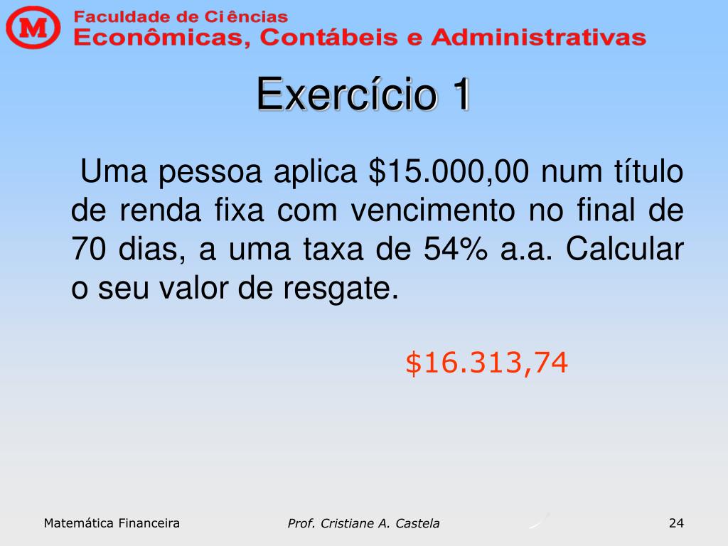 Exercício 1 Uma pessoa aplica $15.000,00 num título de renda fixa com vencimento no final de 70 dias, a uma taxa de 54% a.a. Calcular o seu valor de resgate. $16.313,74 Matemática Financeira 24 Prof. Cristiane A. Castela