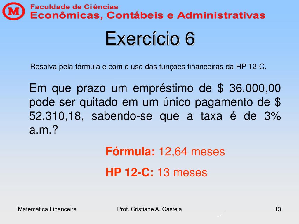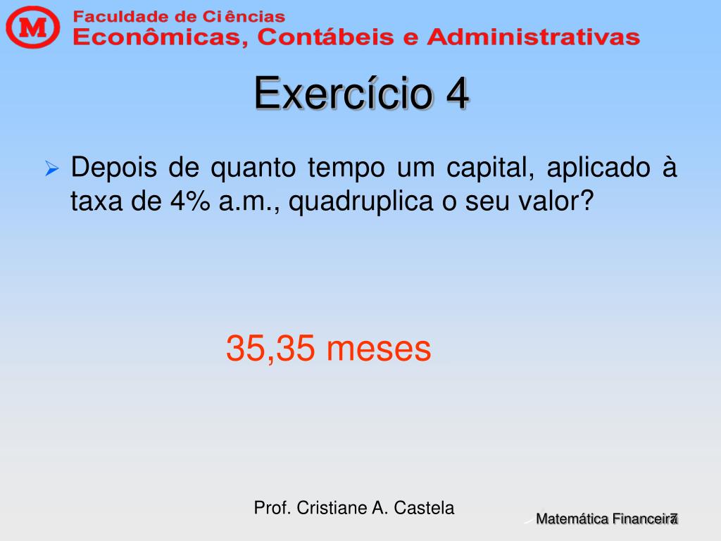 Prof. Cristiane A. Castela Exercício 4 • Depois de quanto tempo um capital, aplicado à taxa de 4% a.m., quadruplica o seu valor? 35,35 meses
