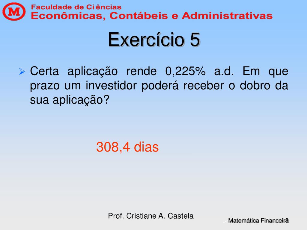 Prof. Cristiane A. Castela Exercício 5 • Certa aplicação rende 0,225% a.d. Em que prazo um investidor poderá receber o dobro da sua aplicação? 308,4 dias
