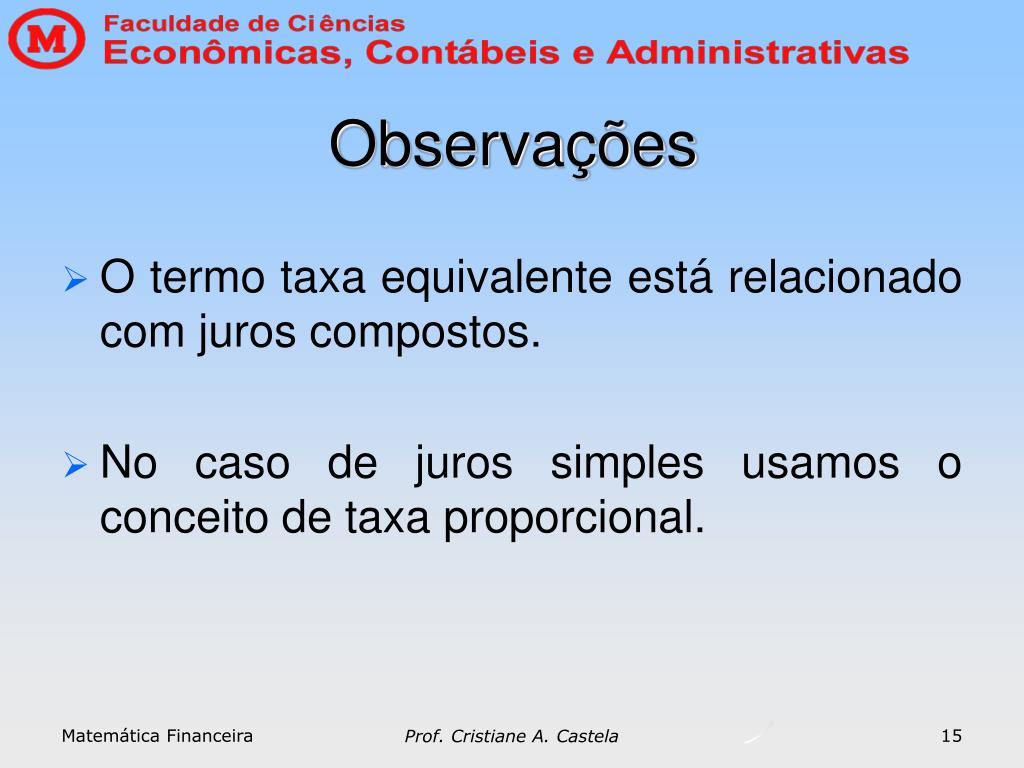 Observações O termo taxa equivalente está relacionado com juros compostos. No caso de juros simples usamos o conceito de taxa proporcional. Matemática Financeira 15 Prof. Cristiane A. Castela