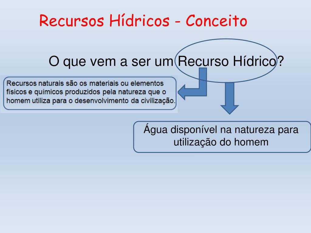 Recursos Hídricos - Conceito O que vem a ser um Recurso Hídrico? Água disponível na natureza para utilização do homem