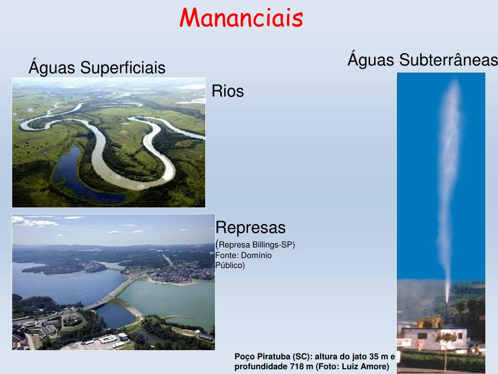 Mananciais Águas Subterrâneas Águas Superficiais Rios Represas (Represa Billings-SP) Fonte: Domínio Público) Poço Piratuba (SC): altura do jato 35 m e profundidade 718 m (Foto: Luiz Amore)