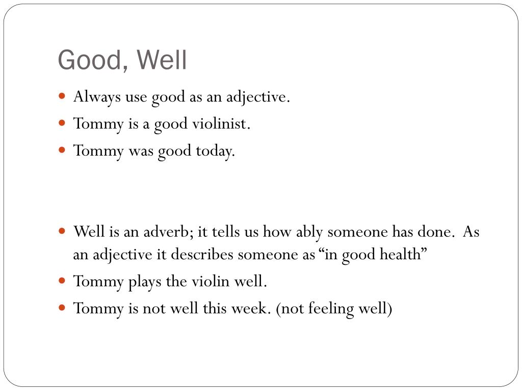 Good, Well • Always use good as an adjective. • Tommy is a good violinist. • Tommy was good today. • Well is an adverb; it tells us how ably someone has done. As an adjective it describes someone as “in good health” • Tommy plays the violin well. • Tommy is not well this week. (not feeling well)