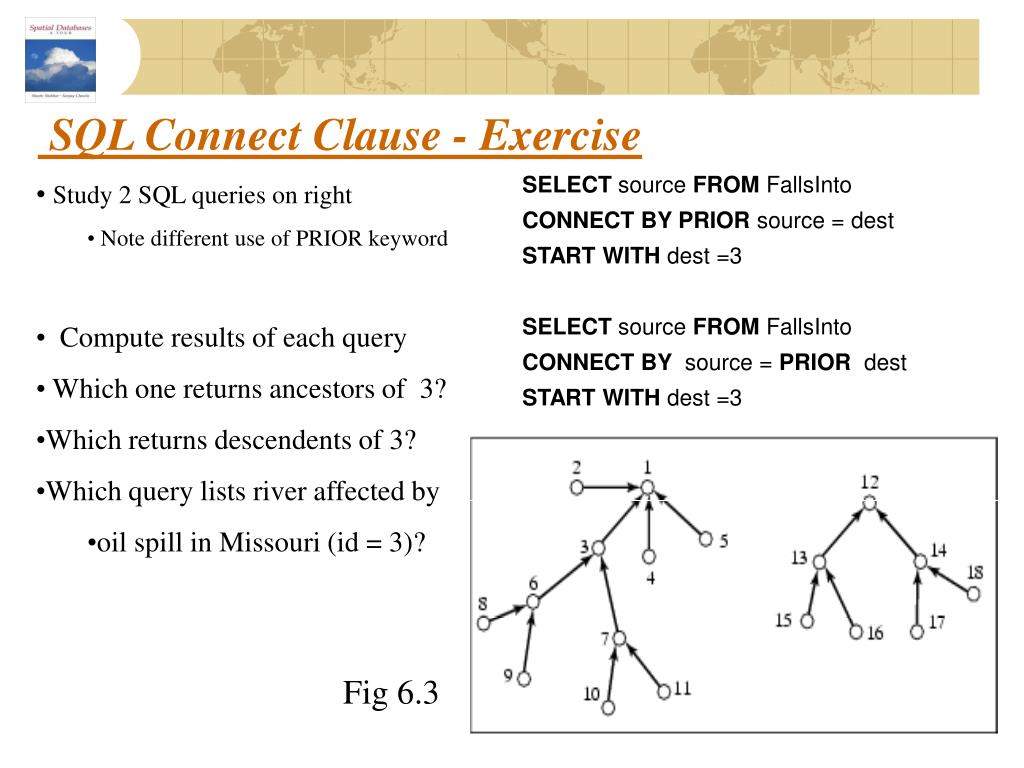 SQL Connect Clause - Exercise • Study 2 SQL queries on right • Note different use of PRIOR keyword • Compute results of each query • Which one returns ancestors of 3? • Which returns descendents of 3? • Which query lists river affected by • oil spill in Missouri (id = 3)? SELECT source FROM FallsInto CONNECT BY PRIOR source = dest START WITH dest =3 SELECT source FROM FallsInto CONNECT BY source = PRIOR dest START WITH dest =3 Fig 6.3