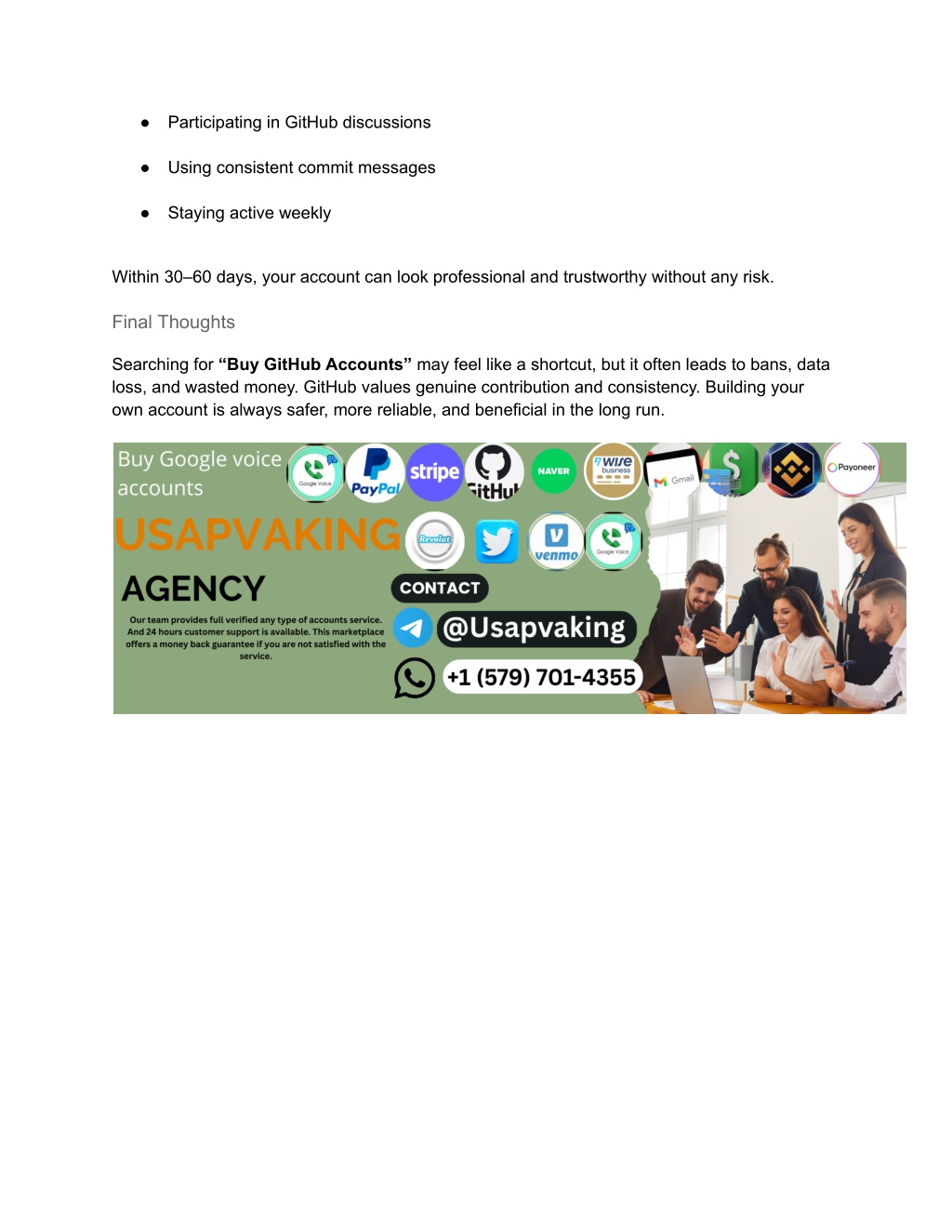 4. 24/7 Support Available ⭐⭐⭐⭐⭐⭐⭐ Need help or have questions? Our support team is online 24/7 to assist you anytime. Contact Us Whatsapp: +1 (579) 701-4355 Telegram:@Usapvaking Sellers often advertise “aged”, “verified”, or “high‑activity” accounts, but there is no guarantee of safety or longevity. Safe & Legal Alternatives to Buying GitHub Accounts Instead of buying an account, consider these safe options: ● Create your own GitHub account ● Optimize your profile with a clear bio and photo ● Contribute to open‑source projects ● Make daily commits, even small ones ● Showcase real projects and documentation These methods build real trust and long‑term value. How to Grow a Trusted GitHub Account Faster You can grow your GitHub profile organically by: ● Forking popular repositories ● Fixing small bugs or improving documentation