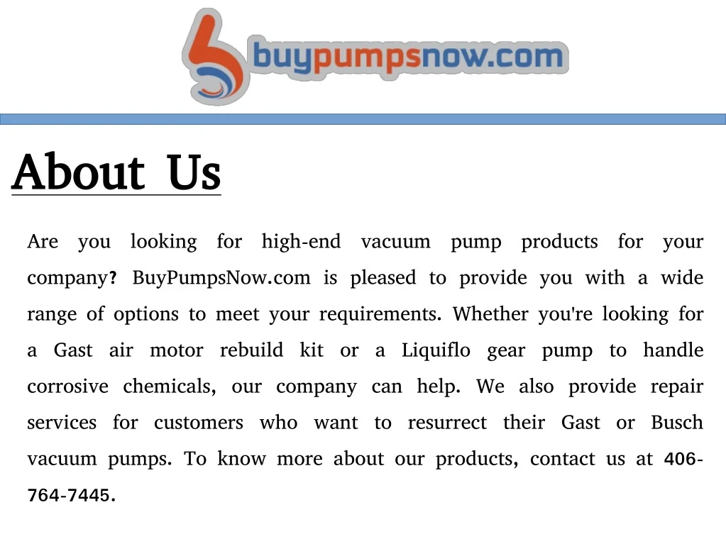 About Us Are you looking for high-end vacuum pump products for your company? BuyPumpsNow.com is pleased to provide you with a wide range of options to meet your requirements. Whether you're looking for a Gast air motor rebuild kit or a Liquiflo gear pump to handle corrosive chemicals, our company can help. We also provide repair services for customers who want to resurrect their Gast or Busch vacuum pumps. To know more about our products, contact us at 406-764-7445.