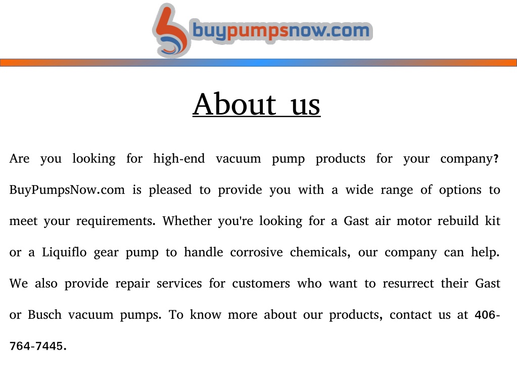 About us Are you looking for high-end vacuum pump products for your company? BuyPumpsNow.com is pleased to provide you with a wide range of options to meet your requirements. Whether you're looking for a Gast air motor rebuild kit or a Liquiflo gear pump to handle corrosive chemicals, our company can help. We also provide repair services for customers who want to resurrect their Gast or Busch vacuum pumps. To know more about our products, contact us at 406- 764-7445.