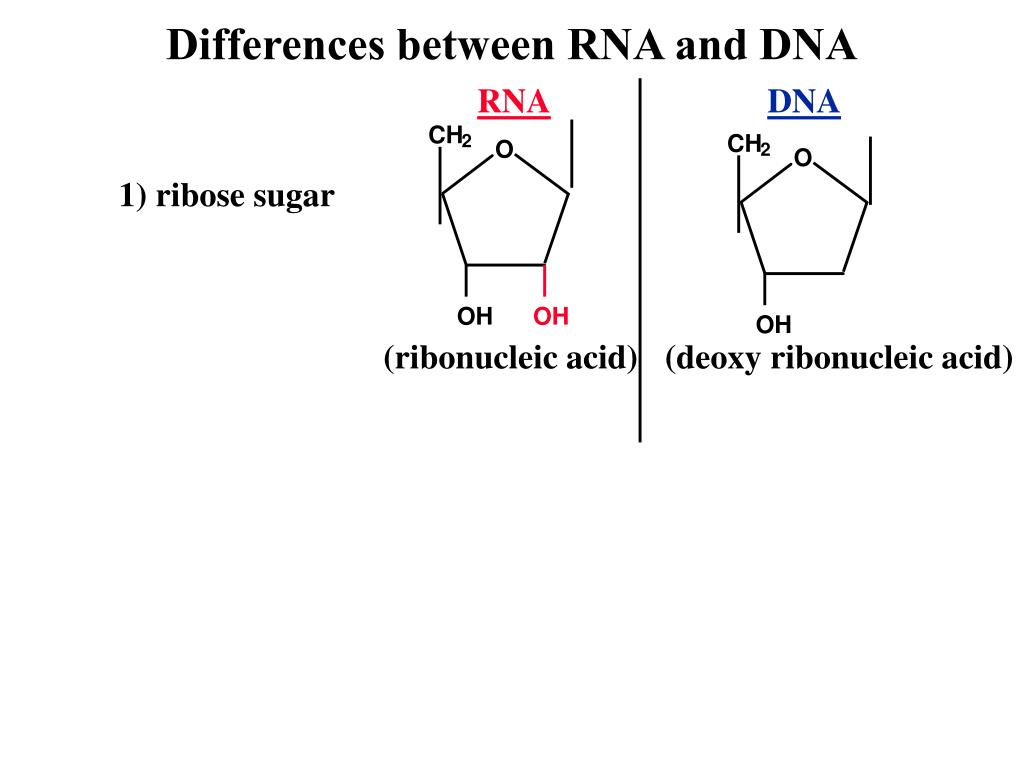 CH CH 2 2 Differences between RNA and DNA RNA DNA O O 1) ribose sugar OH OH OH (ribonucleic acid) (deoxy ribonucleic acid)