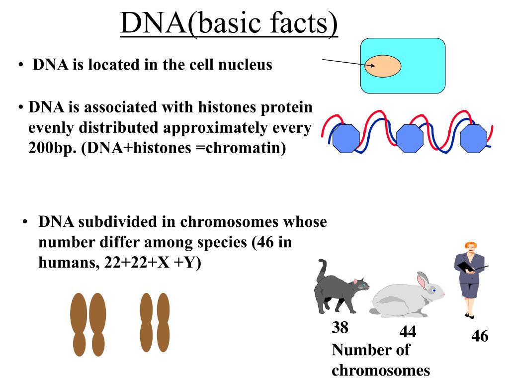 DNA is located in the cell nucleus • DNA is associated with histones protein evenly distributed approximately every 200bp. (DNA+histones =chromatin) • DNA subdivided in chromosomes whose number differ among species (46 in humans, 22+22+X +Y) 38 44 46 Number of chromosomes DNA(basic facts)