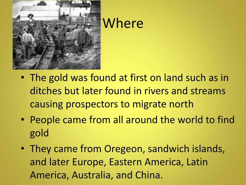 Where • The gold was found at first on land such as in ditches but later found in rivers and streams causing prospectors to migrate north • People came from all around the world to find gold • They came from Oregeon, sandwich islands, and later Europe, Eastern America, Latin America, Australia, and China.