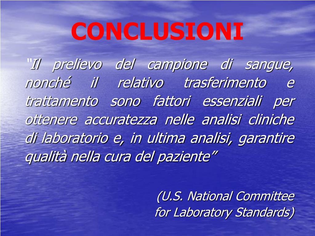 CONCLUSIONI “Il prelievo del campione di sangue, nonché il relativo trasferimento e trattamento sono fattori essenziali per ottenere accuratezza nelle analisi cliniche di laboratorio e, in ultima analisi, garantire qualità nella cura del paziente” (U.S. National Committee for Laboratory Standards)