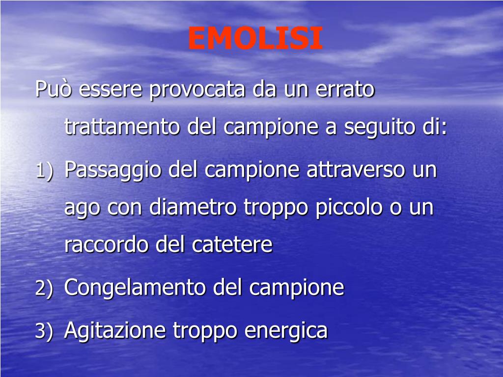 EMOLISI Può essere provocata da un errato trattamento del campione a seguito di: Passaggio del campione attraverso un ago con diametro troppo piccolo o un raccordo del catetere Congelamento del campione Agitazione troppo energica