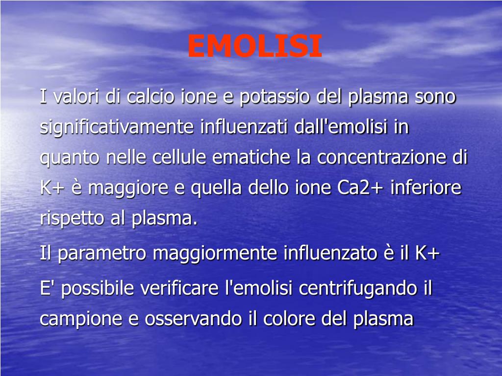 EMOLISI I valori di calcio ione e potassio del plasma sono significativamente influenzati dall'emolisi in quanto nelle cellule ematiche la concentrazione di K+ è maggiore e quella dello ione Ca2+ inferiore rispetto al plasma. Il parametro maggiormente influenzato è il K+ E' possibile verificare l'emolisi centrifugando il campione e osservando il colore del plasma