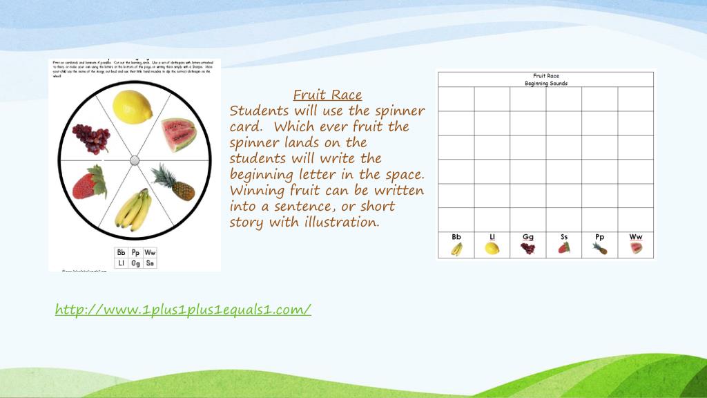Fruit Race Students will use the spinner card. Which ever fruit the spinner lands on the students will write the beginning letter in the space. Winning fruit can be written into a sentence, or short story with illustration. http://www.1plus1plus1equals1.com/