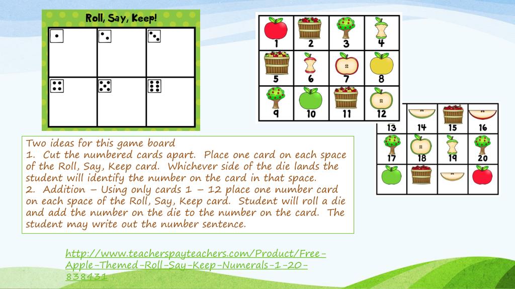 Two ideas for this game board 1. Cut the numbered cards apart. Place one card on each space of the Roll, Say, Keep card. Whichever side of the die lands the student will identify the number on the card in that space. 2. Addition – Using only cards 1 – 12 place one number card on each space of the Roll, Say, Keep card. Student will roll a die and add the number on the die to the number on the card. The student may write out the number sentence. http://www.teacherspayteachers.com/Product/Free-Apple-Themed-Roll-Say-Keep-Numerals-1-20-838431