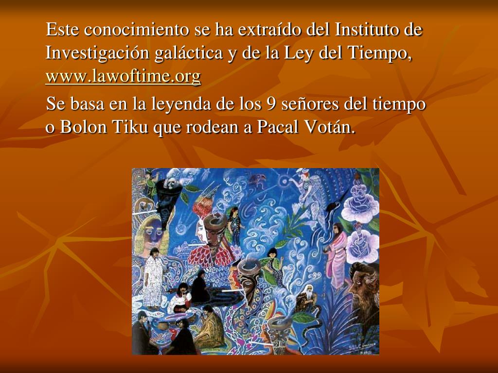 Este conocimiento se ha extraído del Instituto de Investigación galáctica y de la Ley del Tiempo, www.lawoftime.org Se basa en la leyenda de los 9 señores del tiempo o Bolon Tiku que rodean a Pacal Votán.