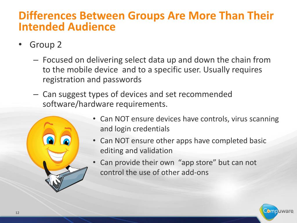 Differences Between Groups Are More Than Their Intended Audience • Group 1 • Focused on delivering data up and down the chain from the mobile device to a main computer and business applications • Usually can control the devices it interacts with thru firewall and MDM strategies. • Can ensure devices have controls, virus scanning and login credentials • Can ensure their apps have completed basic editing and validation • Can provide their own “app store” to ensure data has been processed in a specific way, i.e. use of MS Excel rather than a third party freeware program • IS responsible for pushing new versions of software to the devices