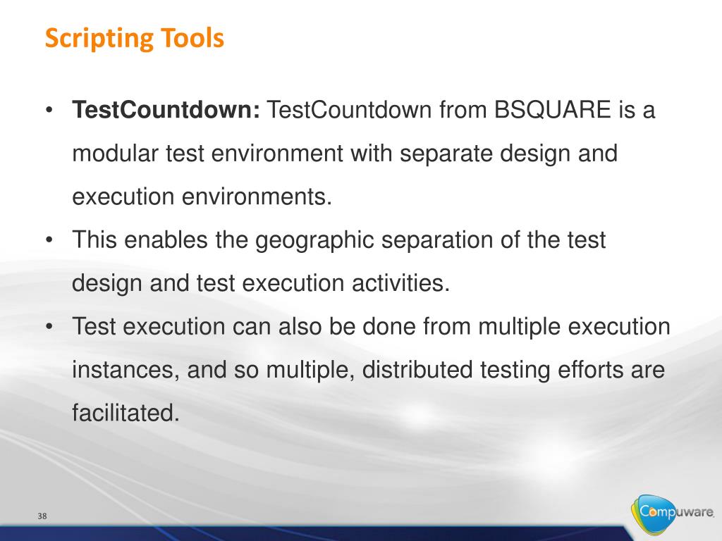 Scripting Tools • TestCountdown: TestCountdown from BSQUARE is a modular test environment with separate design and execution environments. • This enables the geographic separation of the test design and test execution activities. • Test execution can also be done from multiple execution instances, and so multiple, distributed testing efforts are facilitated.