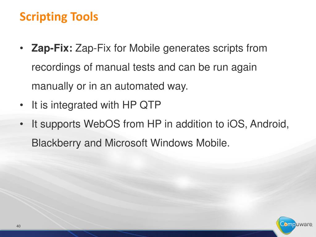Scripting Tools • Zap-Fix: Zap-Fix for Mobile generates scripts from recordings of manual tests and can be run again manually or in an automated way. • It is integrated with HP QTP • It supports WebOS from HP in addition to iOS, Android, Blackberry and Microsoft Windows Mobile.